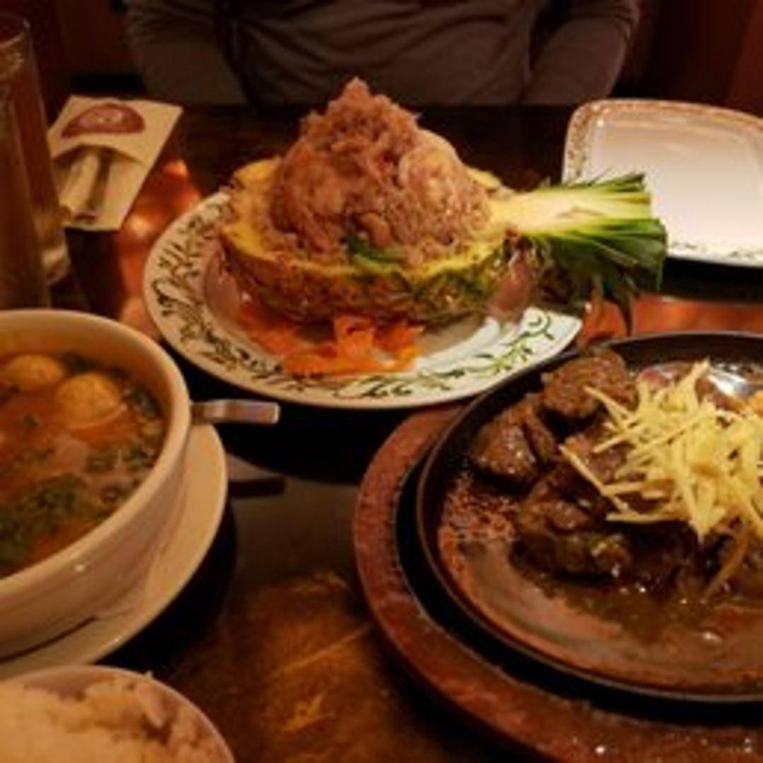 A delightful and aromatic Thai-style fried rice that combines fragrant jasmine rice with sweet pineapple chunks. This colorful dish often includes a choice of protein (like chicken or shrimp), cashews, raisins, and a medley of mixed vegetables such as peas and carrots, all seasoned with a hint of curry powder for a golden hue and aromatic depth. It's a harmonious blend of sweet and savory flavors.