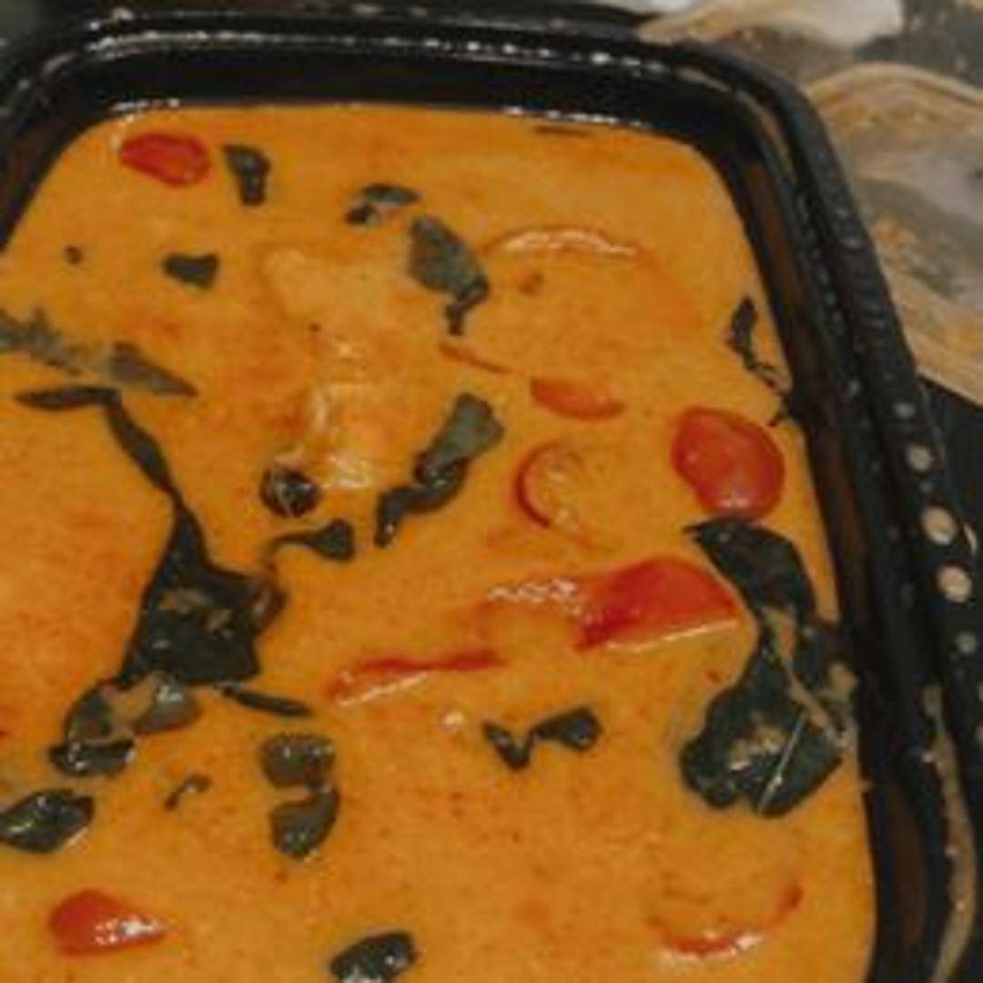 A classic and robust Thai Red Curry, featuring tender slices of beef simmered in a fiery red chili paste and rich coconut milk, infused with bamboo shoots, bell peppers, and fragrant basil leaves. A perfect balance of spice and creamy texture.