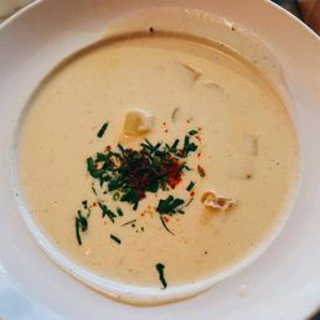 A creamy and rich New England-style clam chowder featuring tender Wellfleet clams, potatoes, and smoky bacon, seasoned with classic herbs and spices.