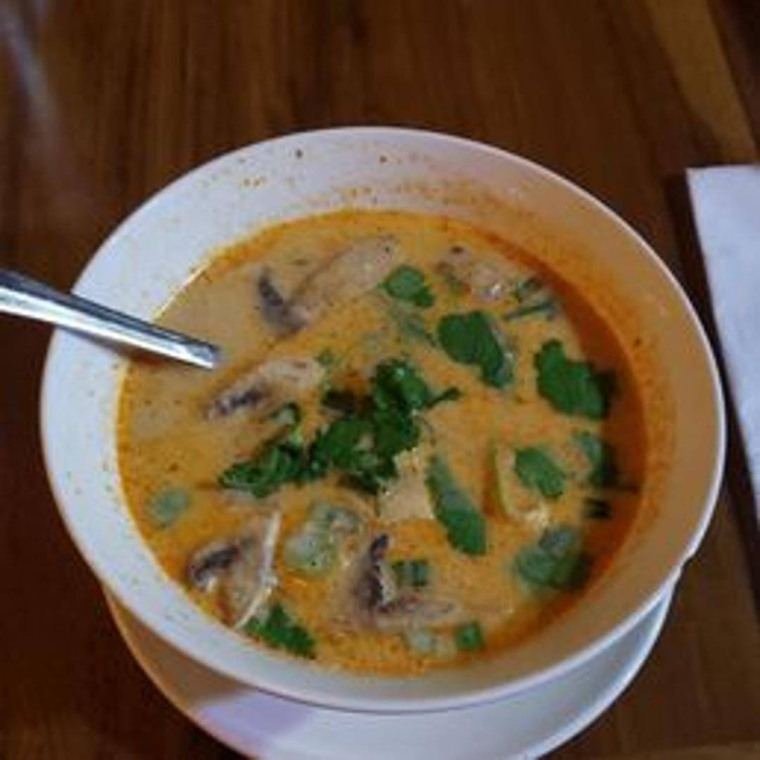 A fragrant and creamy coconut soup, Tom Kha is a beloved Thai classic. It features a harmonious blend of galangal, lemongrass, kaffir lime leaves, and mushrooms simmered in a rich coconut milk broth. Often prepared with chicken (or your choice of protein), the soup offers a delicate balance of tangy lime juice, a hint of savory fish sauce, and a subtle warmth from chili, creating a comforting and aromatic experience.