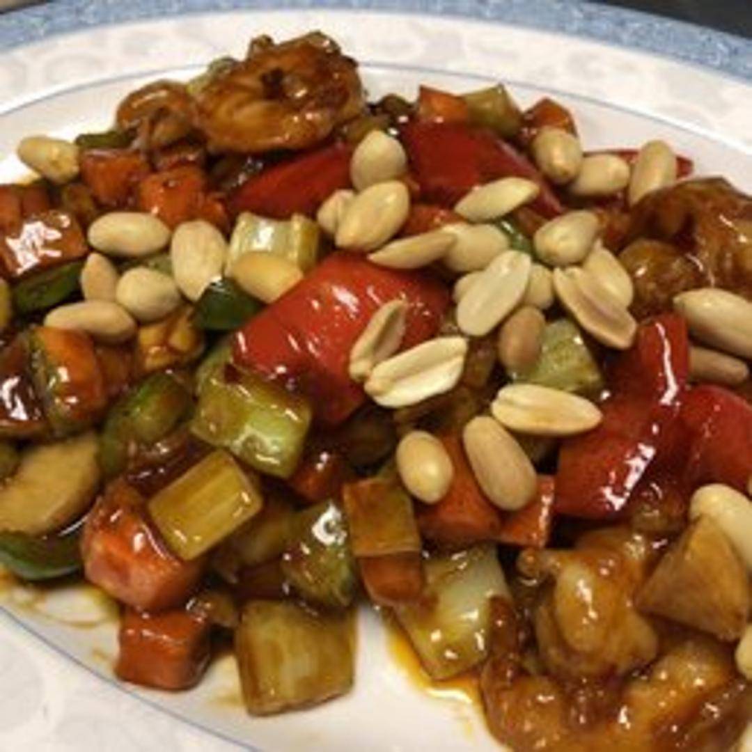 Diced chicken stir-fried with peanuts, vegetables, and dried chili peppers in a spicy Kung Pao sauce. Served with steamed rice.