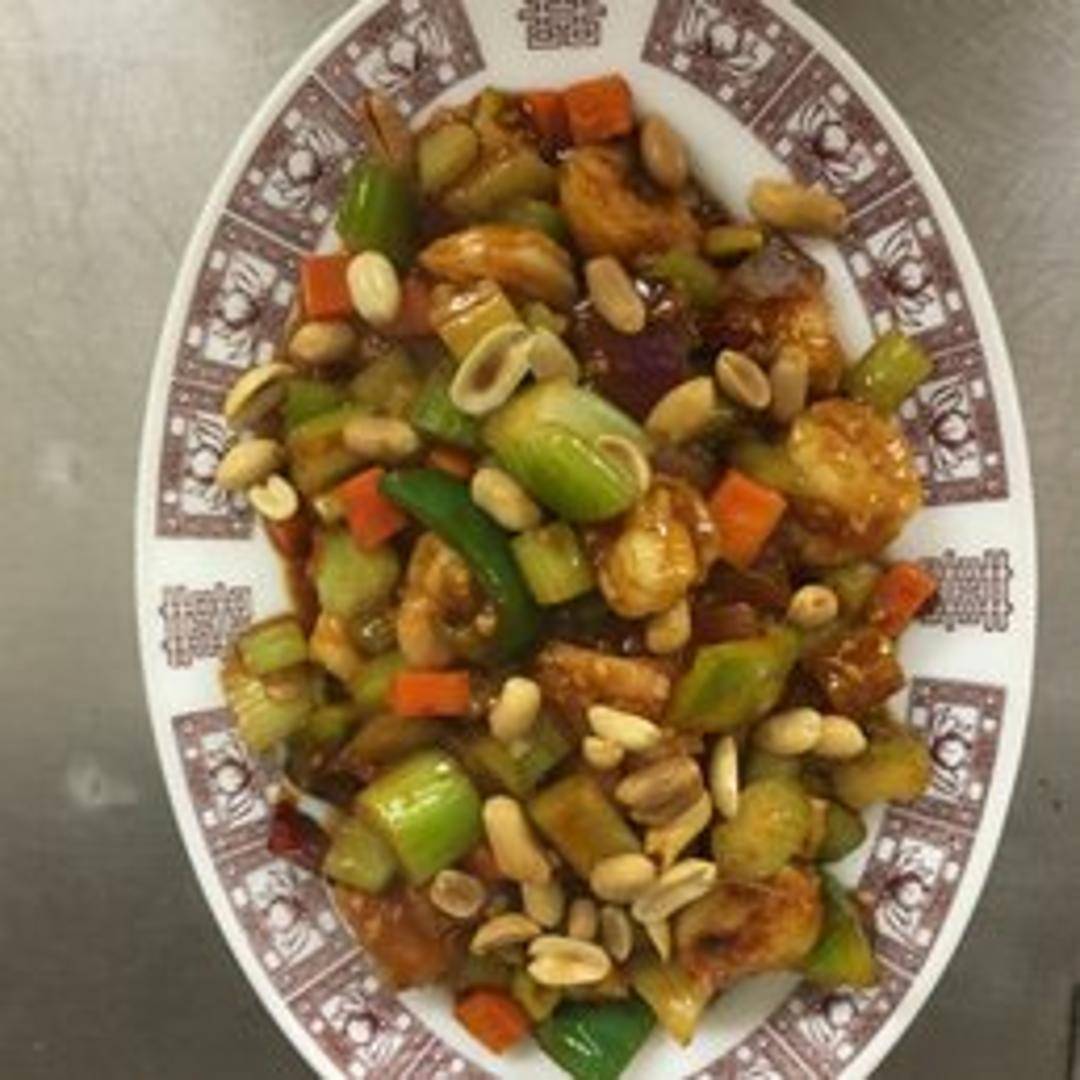 Crispy tofu stir-fried with peanuts, vegetables, and chili peppers in a spicy and flavorful Kung Pao sauce. Garnished with scallions.