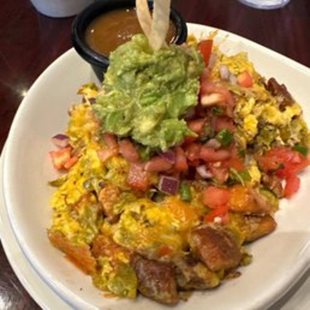 Slow-cooked pork carnitas served in a skillet with potatoes, onions, peppers, and topped with two eggs any style. Served with tortillas.