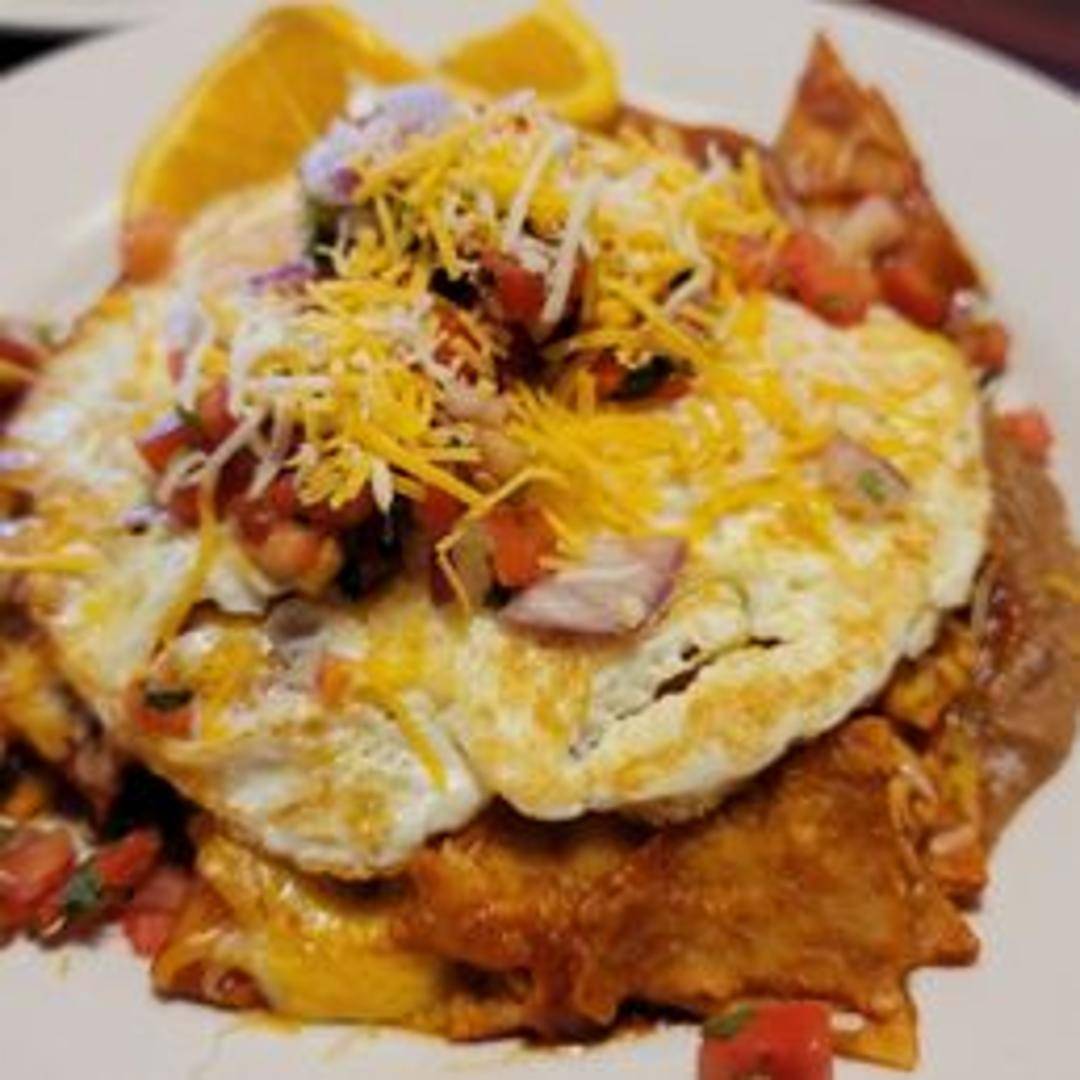 Crispy tortilla chips simmered in green or red salsa, topped with cheese, onions, sour cream, and two eggs any style.