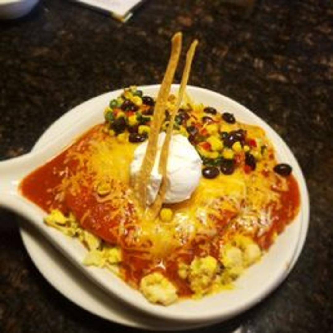 Shredded chicken or beef, corn tortillas, and enchilada sauce baked in a skillet with cheese. Topped with two eggs any style. Served with rice and beans.