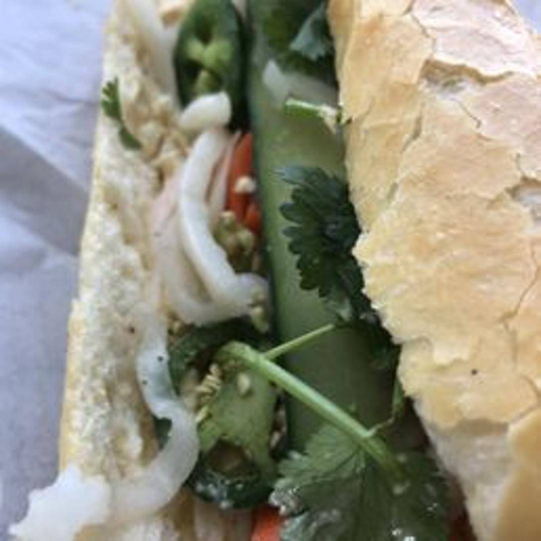 A Vietnamese sandwich featuring seasoned chicken, typically grilled or shredded, along with pickled vegetables, cilantro, jalapenos, and mayonnaise on a toasted baguette.