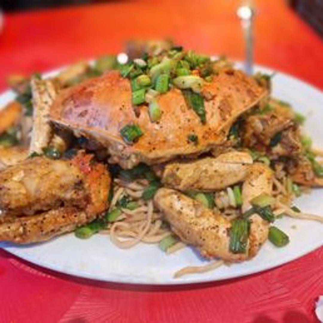 A signature dish featuring a whole Dungeness crab, stir-fried with a generous amount of garlic, green onions, and spices. The crab is typically cooked in a wok over high heat, resulting in a flavorful and aromatic crustacean. The meat is succulent and infused with the savory garlic sauce.