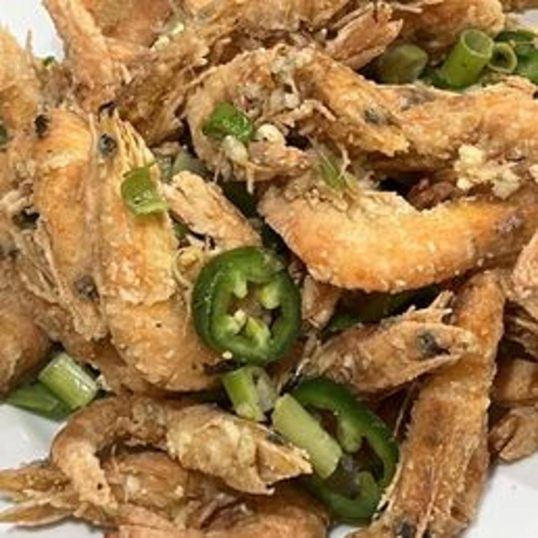 Large shrimp, lightly battered and deep-fried until crispy. Seasoned with a generous amount of salt, pepper, and often includes fried garlic, scallions, and chili peppers. A savory and flavorful dish with a satisfying crunch.