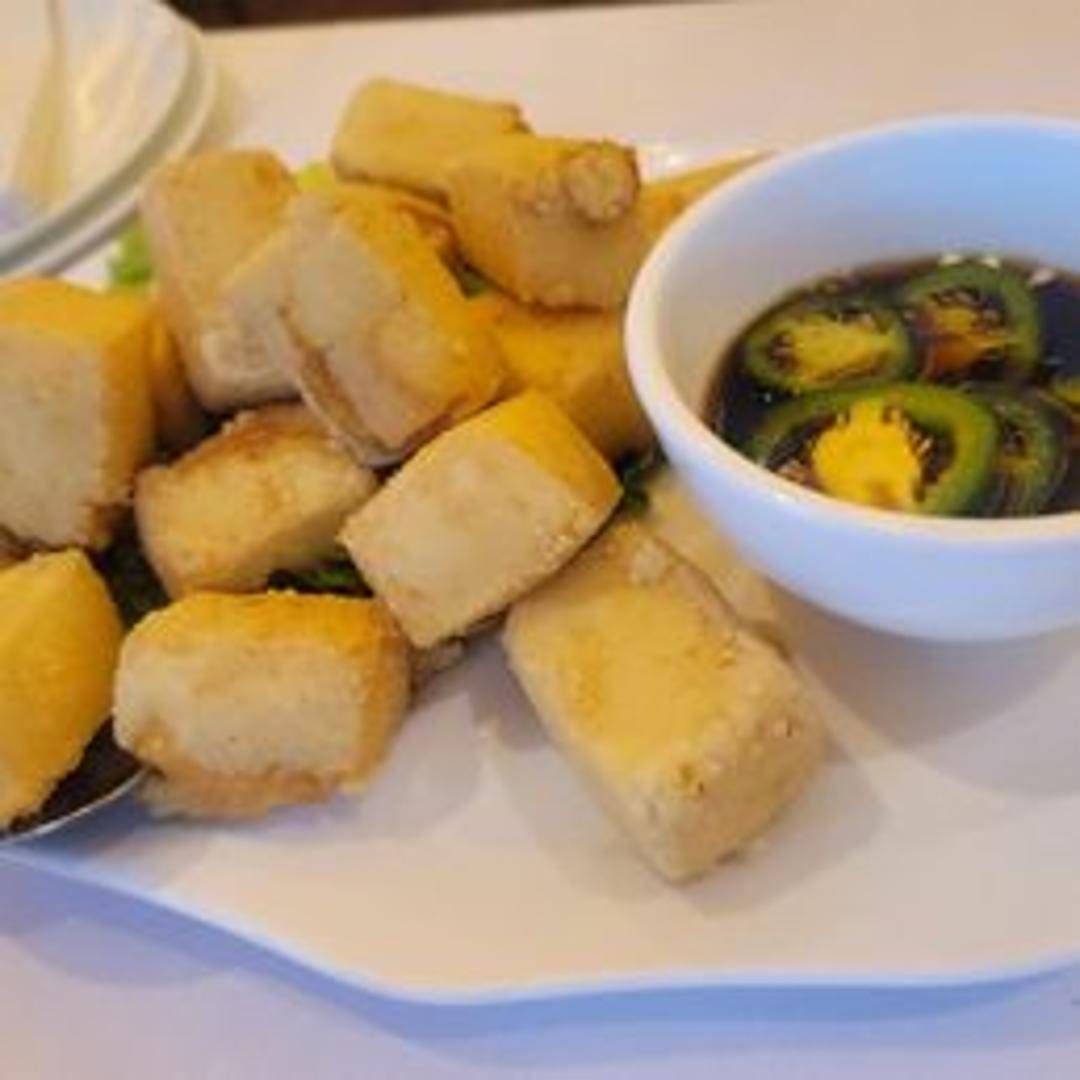 Crispy, golden-brown deep-fried tofu cubes. Typically served with a sweet and sour dipping sauce or a savory soy-based sauce. Garnished with herbs or spices.