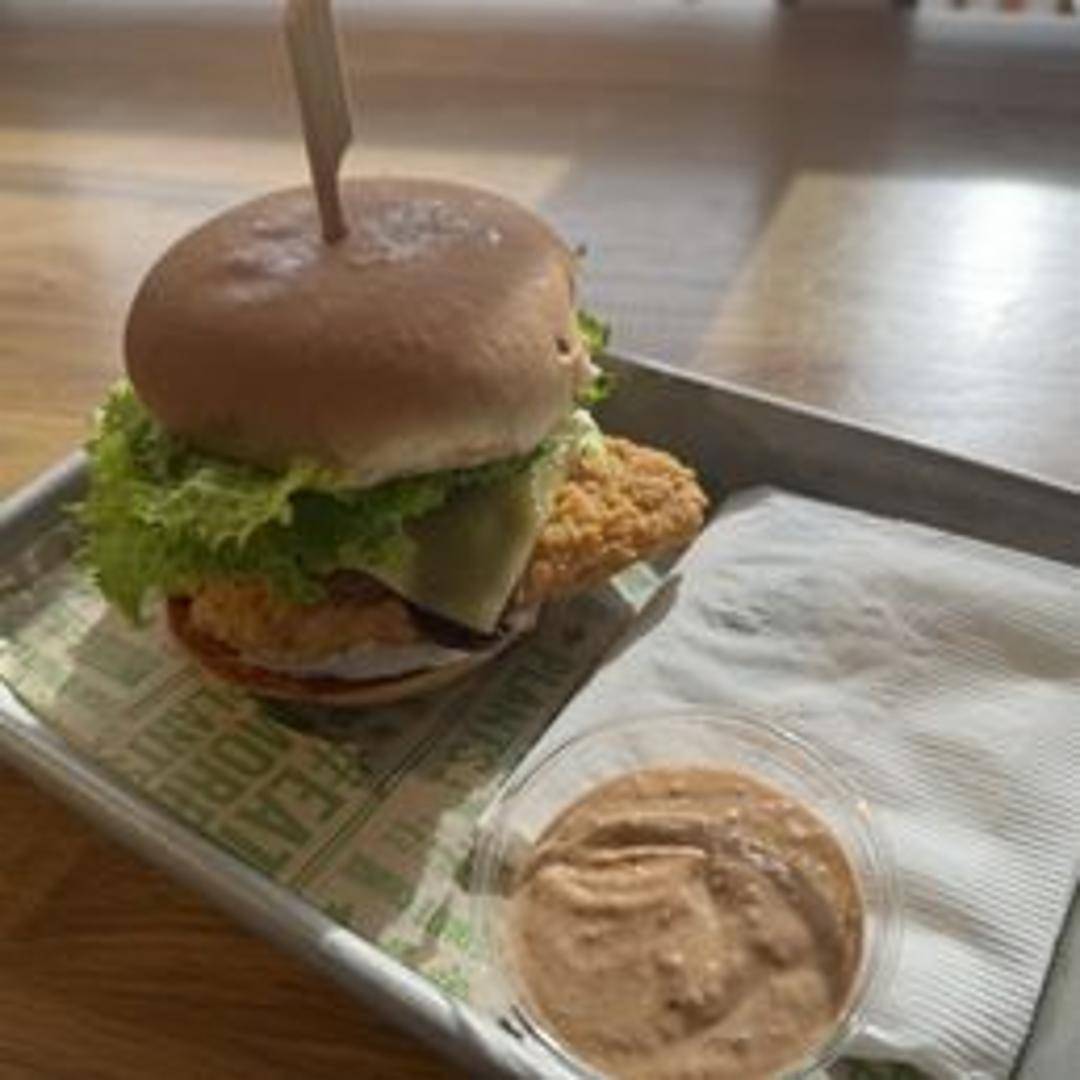Crispy breaded chik'n patty, organic tempeh bacon, organic ranch dressing, organic lettuce, tomato, and pickles on a toasted organic bun.