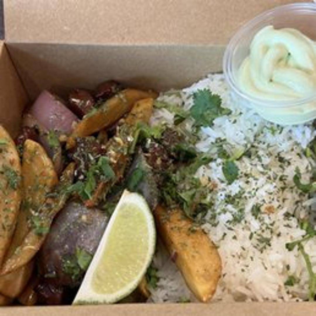 Peruvian stir-fry featuring marinated strips of steak, onions, tomatoes, and peppers, wok-seared and served with french fries and rice.