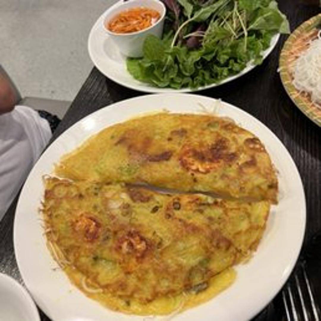 Crispy, savory Vietnamese crepe filled with shrimp, pork, bean sprouts, and onions. Served with fresh herbs and a dipping sauce.