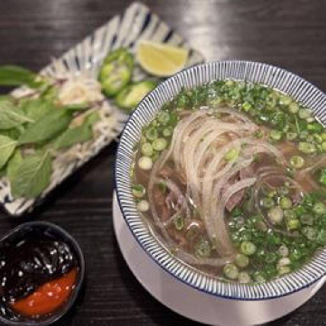 Aromatic Vietnamese rice noodle soup with thinly sliced rare steak. Cooked by the hot broth, creating a tender and flavorful experience. Served with fresh herbs, onions, and bean sprouts. Comes with lime and chili peppers for customization.