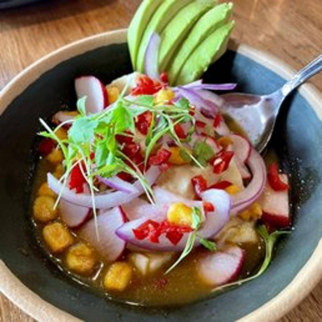 Fresh raw fish cured in citrus juices, such as lemon or lime, and spiced with chili peppers, onions, and other seasonings. Often served with tortilla chips or tostadas.