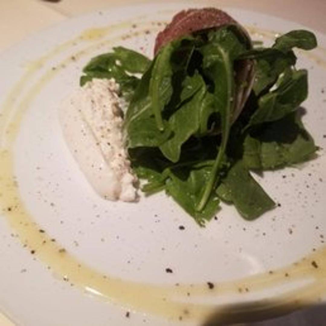 A vibrant and savory salad featuring thinly sliced, aged Italian prosciutto laid over a bed of crisp mixed greens. Complemented by fresh mozzarella pearls, sun-dried tomatoes, and a light balsamic vinaigrette, offering a delightful balance of salty and sweet notes.
