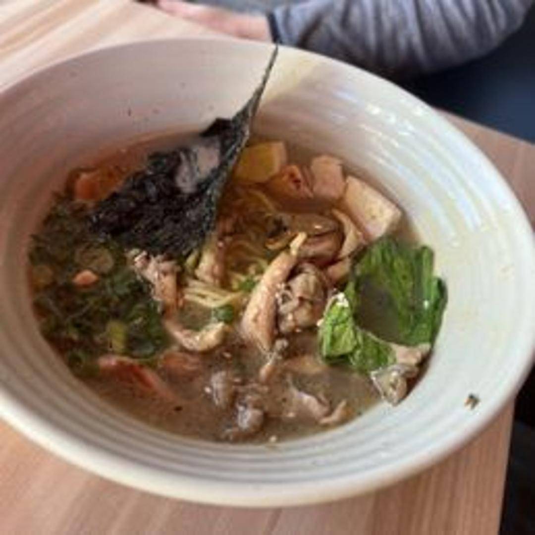 A vegetarian ramen featuring a rich miso broth infused with earthy mushrooms, topped with seasoned bamboo shoots, scallions, nori seaweed, and a soft-boiled egg.
