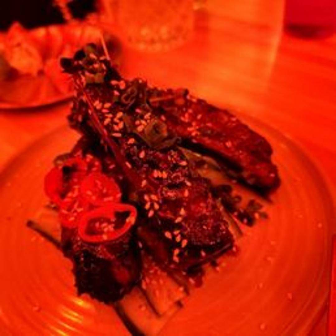 Tender pork ribs glazed with a sweet and savory sticky sauce, served with a side of pickled vegetables.