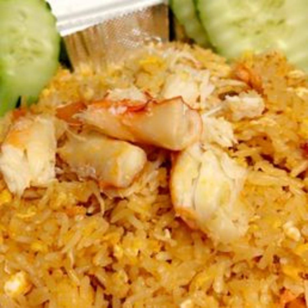 Fried rice cooked with generous portions of crab meat, eggs, vegetables, and soy sauce.