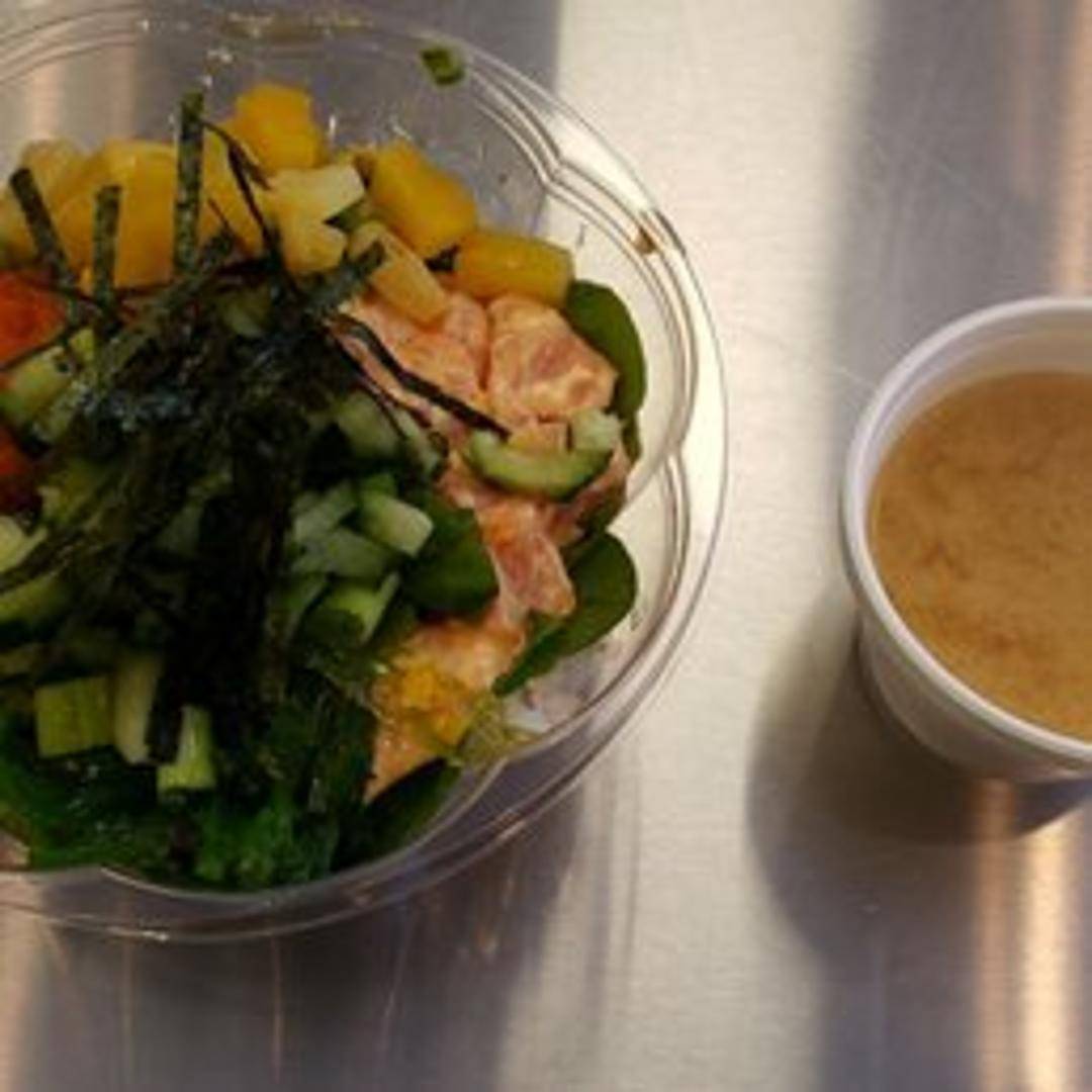 Our signature poke bowl creation. A generous portion of marinated raw tuna and salmon atop a bed of sushi rice, with a vibrant mix of edamame, avocado, seaweed salad, cucumber, masago, crispy onions, and sesame seeds. Finished with our special Ninja sauce.