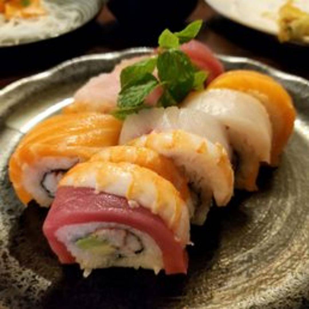 An inside-out sushi roll filled with crab meat, avocado, and cucumber. Topped with an assortment of thinly sliced fresh fish such as tuna, salmon, yellowtail, and avocado, creating a vibrant rainbow effect. Served with soy sauce, wasabi, and ginger.