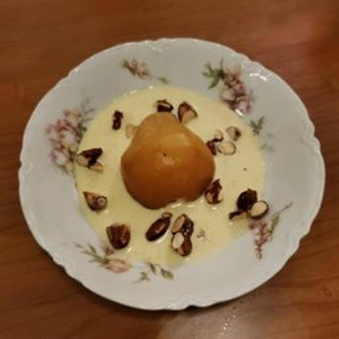 A delicate pear, gently poached in a fragrant syrup, often infused with vanilla, cinnamon, or other warming spices. Served chilled, it offers a sweet and subtly spiced flavor, and is frequently accompanied by a light cream, pastry, or a sprinkle of nuts.