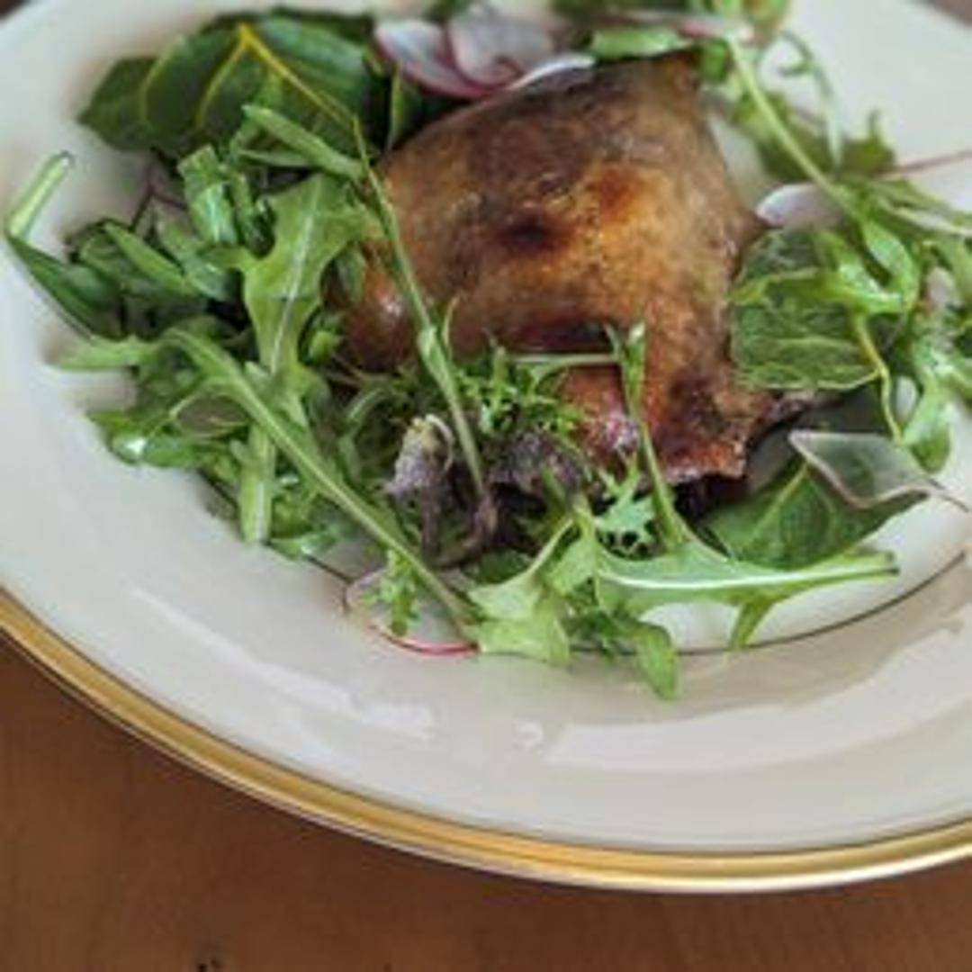 Duck leg slow-cooked in its own fat until tender and succulent, resulting in a rich and flavorful dish. Served with complementary accompaniments, often including potatoes and greens.