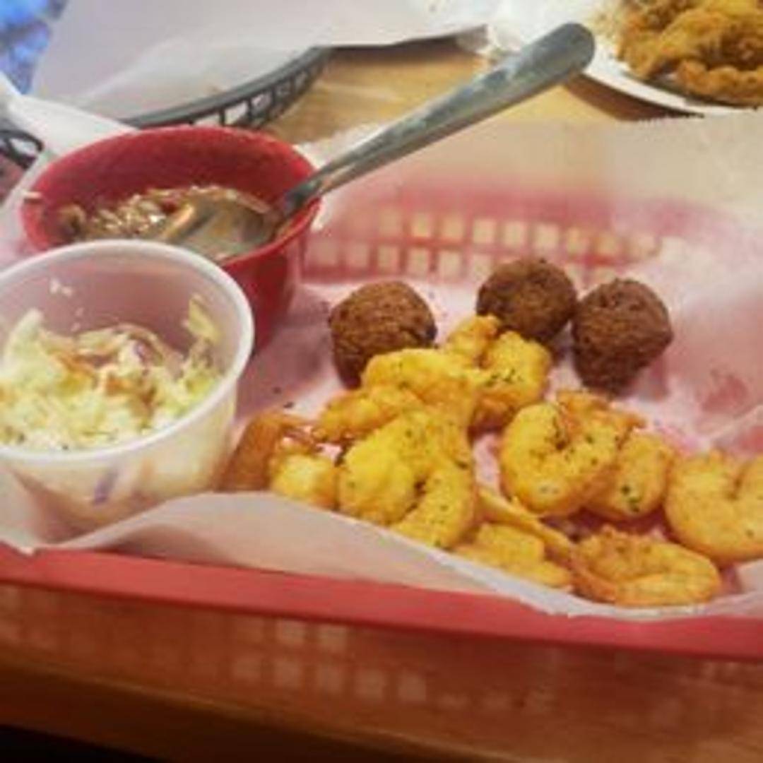 A generous portion of golden-fried shrimp served with your choice of side dishes, such as fries, coleslaw, or potato salad. Includes cocktail sauce and lemon wedges.