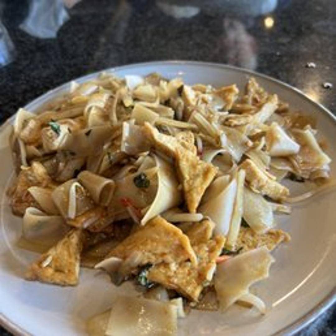 Wide rice noodles stir-fried with basil, bell peppers, onions, tomatoes, and a spicy chili garlic sauce.