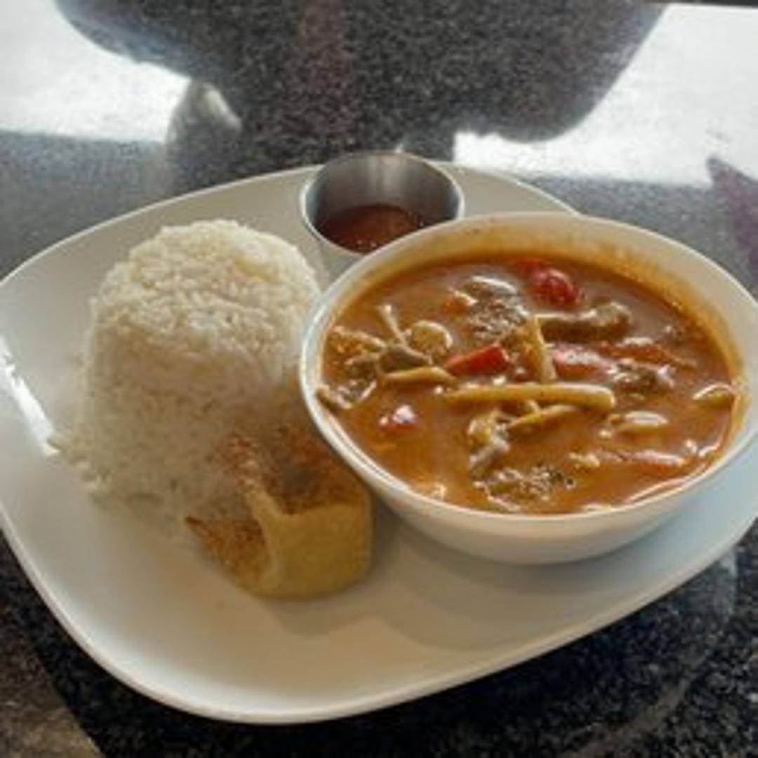 A flavorful red curry infused with peanut sauce, coconut milk, bell peppers, and basil leaves.