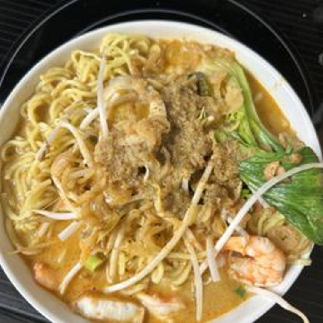 A Malaysian coconut curry noodle soup with vermicelli noodles, tofu puffs, shrimp, bean sprouts, and a hard-boiled egg.