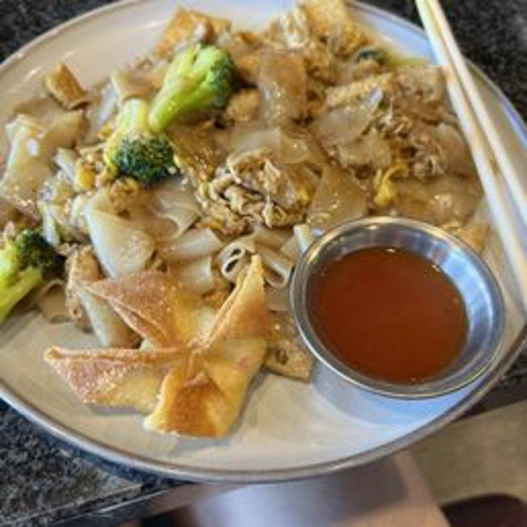 Wide rice noodles stir-fried with Chinese broccoli, egg, and a savory dark soy sauce.