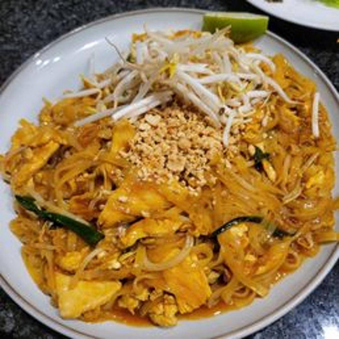 Rice noodles stir-fried with egg, bean sprouts, green onions, and peanuts in a sweet and tangy tamarind sauce.