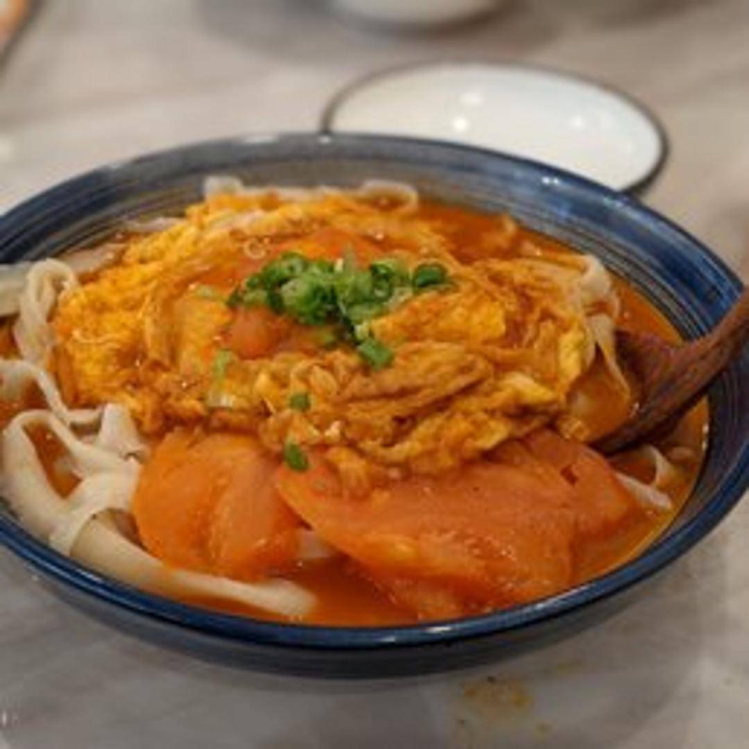 A comforting bowl of noodles served in a flavorful tomato-based broth, topped with fluffy scrambled eggs.