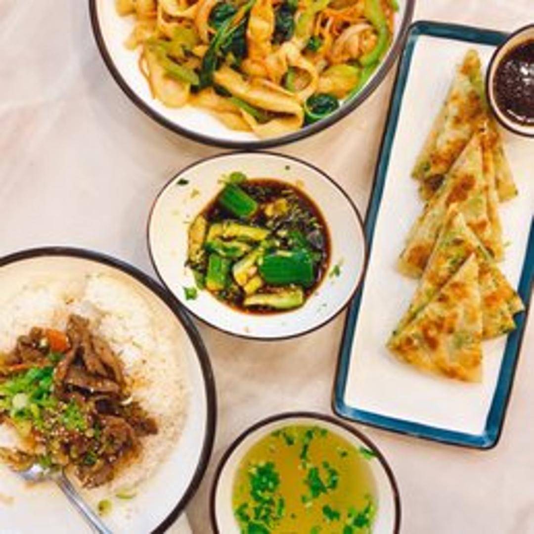 A savory and crispy flatbread made with layers of dough and chopped scallions, pan-fried to a golden brown. Served hot and ready to be dipped.