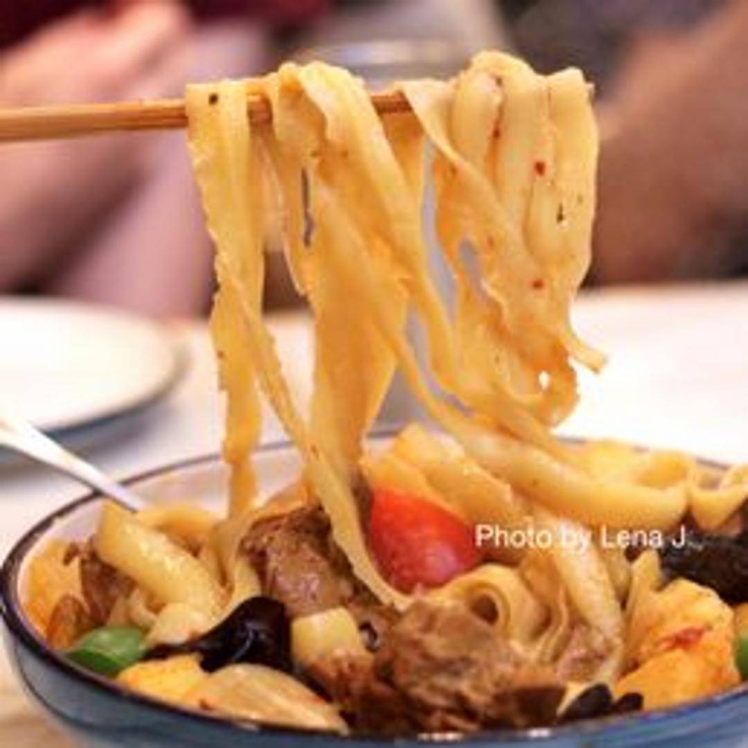 Tender pieces of chicken, slow-braised in a rich and savory sauce, served over a bed of fresh noodles. The broth is deeply flavorful, infused with aromatic spices and herbs. Garnished with fresh greens.