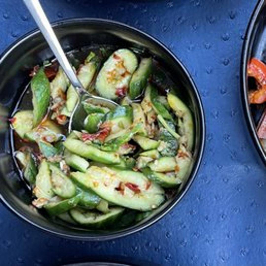 Crisp cucumber marinated in a spicy and tangy sauce with garlic and chili oil. A refreshing and flavorful appetizer.