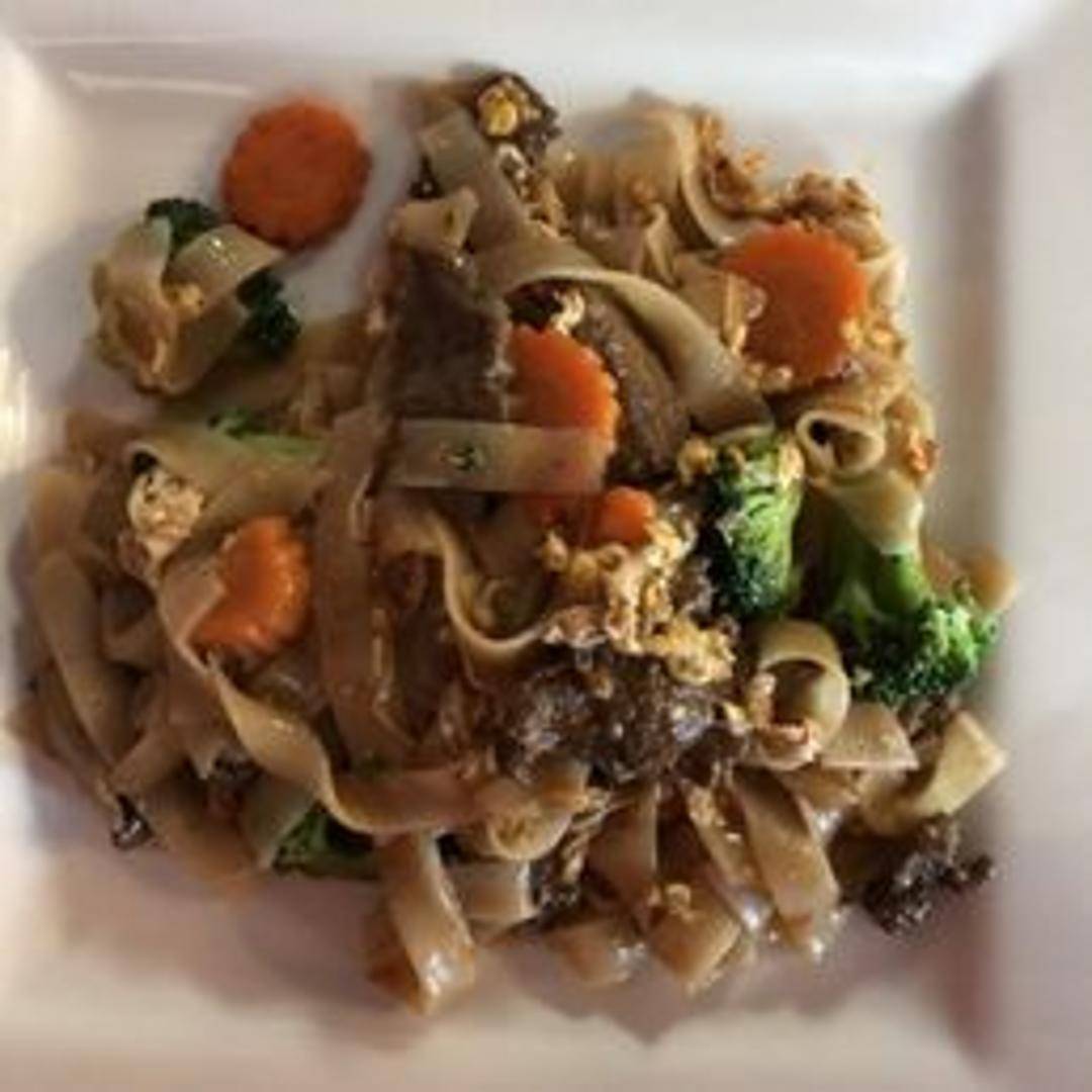Wide rice noodles stir-fried with Chinese broccoli, egg, and your choice of protein (chicken, pork, beef, tofu, or shrimp) in a savory sweet soy sauce.