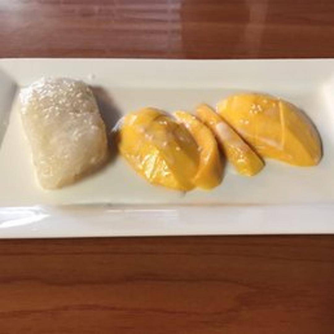 Sweet sticky rice cooked in coconut milk, served with fresh slices of ripe mango and drizzled with a creamy coconut sauce.
