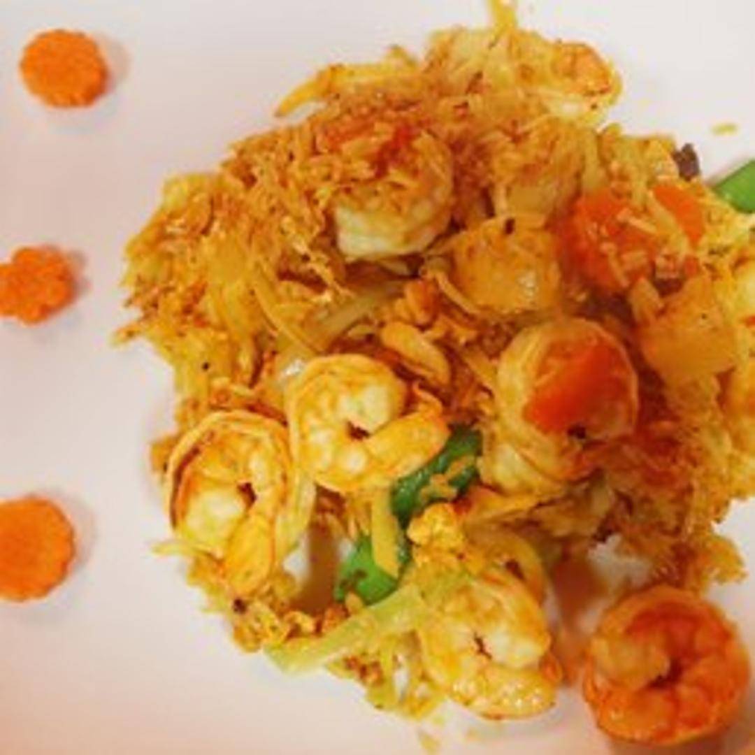 Fragrant jasmine rice stir-fried with pineapple chunks, shrimp, chicken, cashew nuts, raisins, onions, peas, carrots, and a touch of curry powder. Served in a half-pineapple shell.