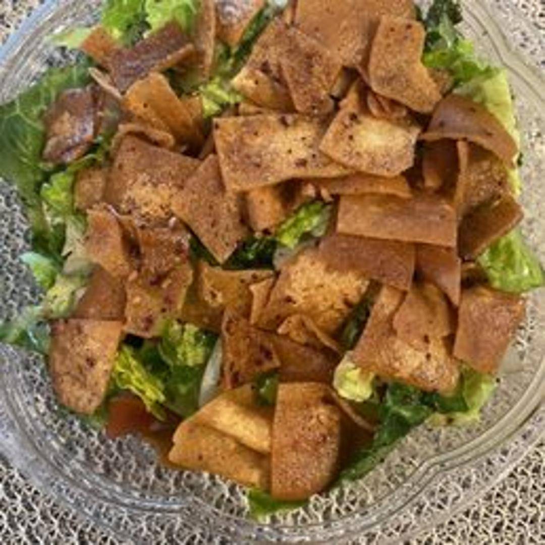 A vibrant Levantine salad featuring mixed greens, tomatoes, cucumbers, radishes, bell peppers, and toasted pita bread, tossed in a tangy sumac vinaigrette.