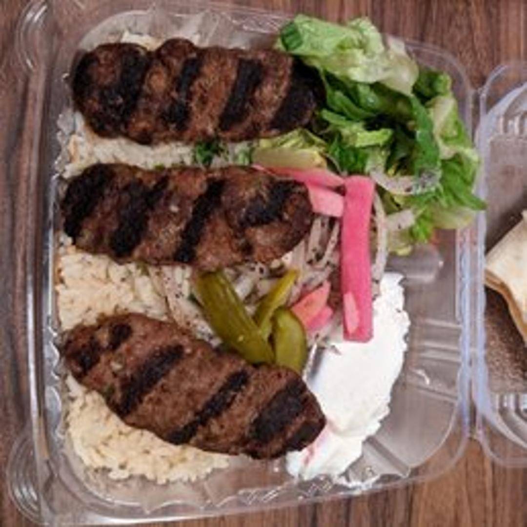 Grilled ground meat kebab, typically made with lamb or beef (may vary by preparation). Served with rice, salad, and sauces.