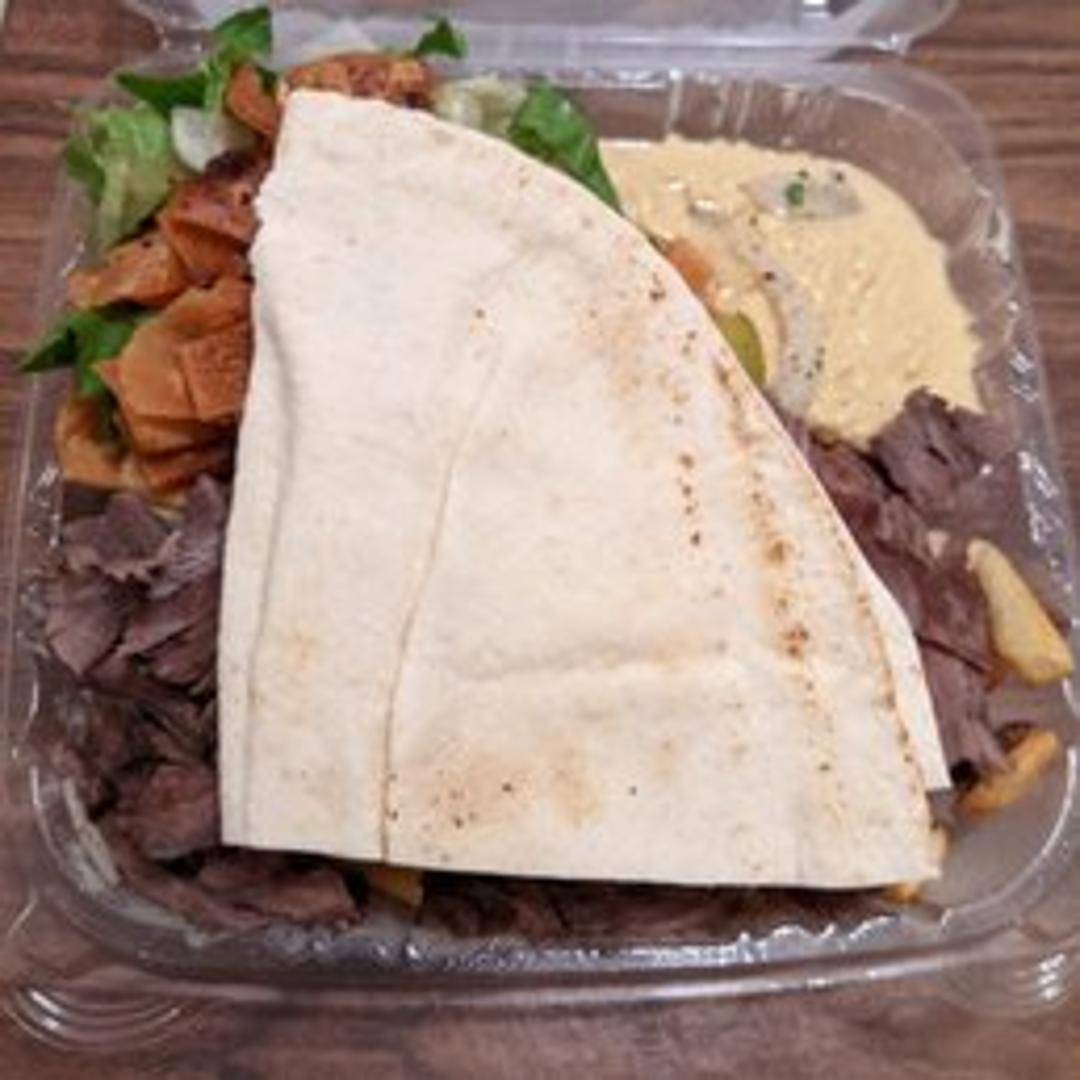 Thinly sliced, marinated beef, slow-cooked on a rotating spit, and served in a warm pita bread with tahini sauce, tomatoes, onions, and pickles.