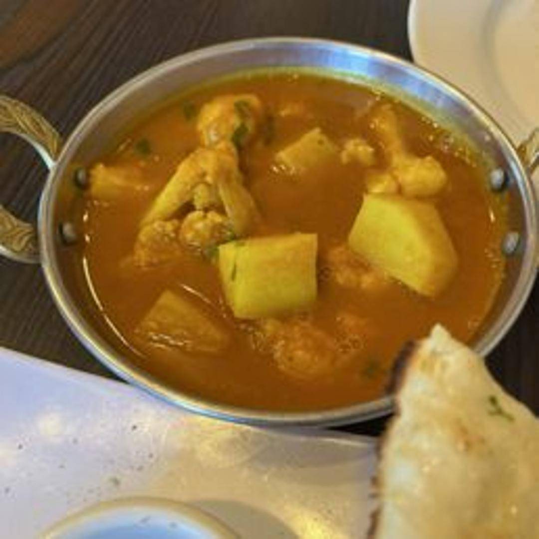 A popular vegetarian Indian dish made with potatoes (aloo) and cauliflower (gobi) stir-fried with onions, tomatoes, ginger, garlic, and a blend of spices like turmeric, cumin, and coriander. A dry, flavorful, and comforting dish.