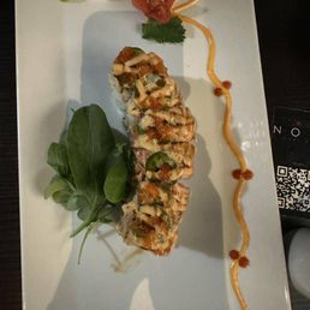 Spicy tuna and cucumber inside, topped with avocado, spicy mayo, and sriracha.