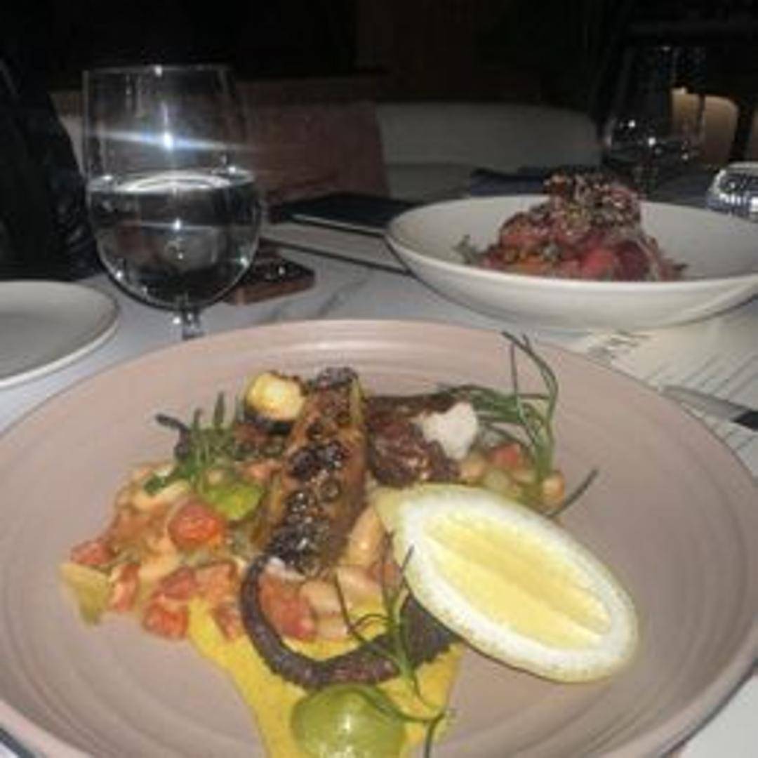Grilled octopus tentacles, perfectly charred and tender, accompanied by fingerling potatoes, chorizo, and a vibrant romesco sauce.