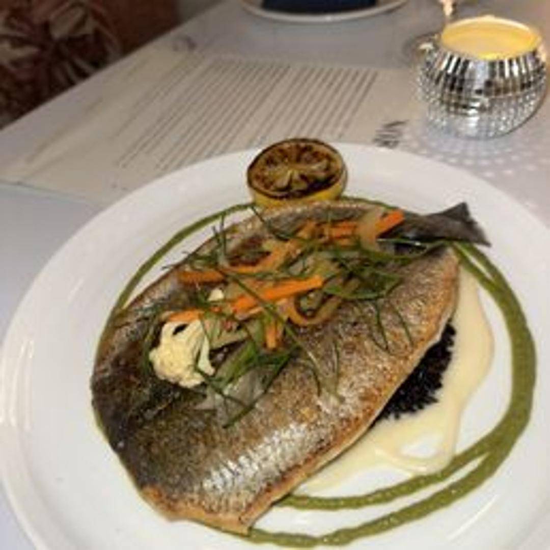 Pan-seared or grilled sea bass, known for its delicate, flaky white flesh and mild, slightly sweet flavor. It is often served with seasonal vegetables, a light sauce, and herbs to complement its natural taste.