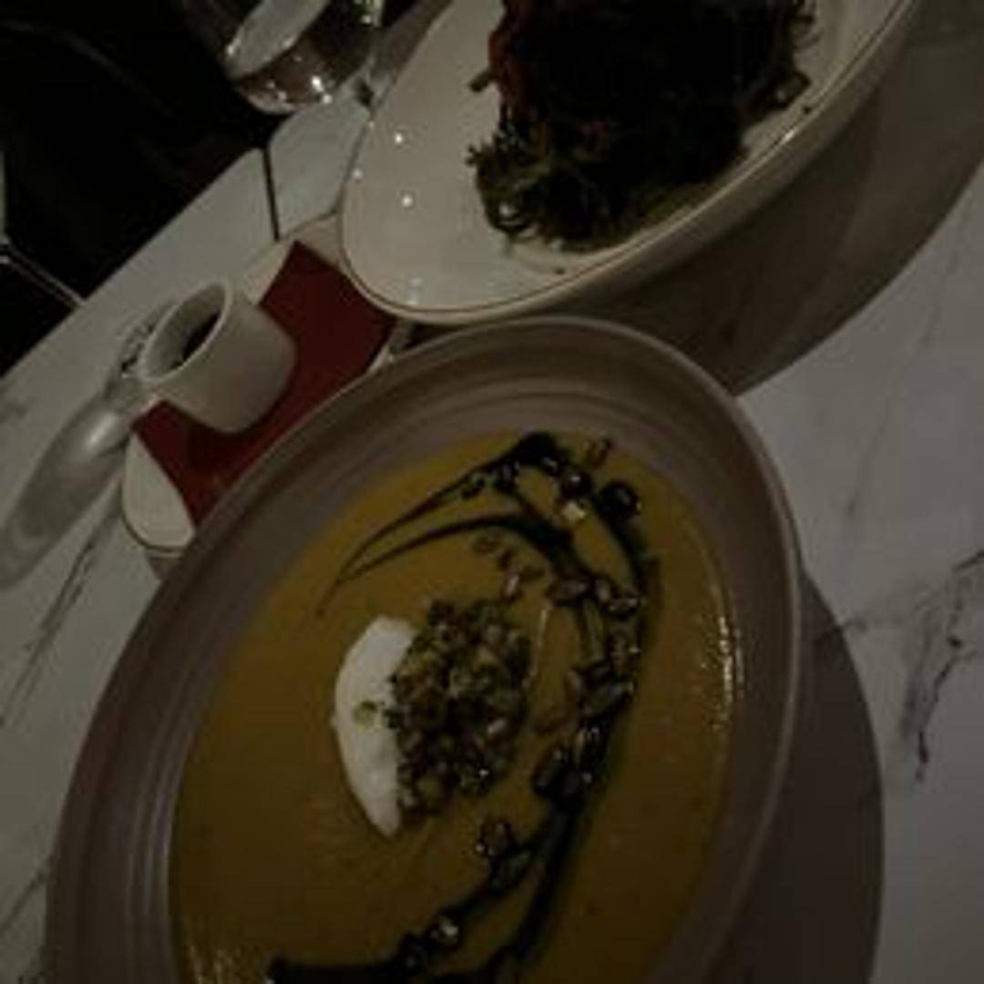 Velvety smooth pumpkin soup with hints of warming spices, garnished with toasted pumpkin seeds and a drizzle of crème fraîche.