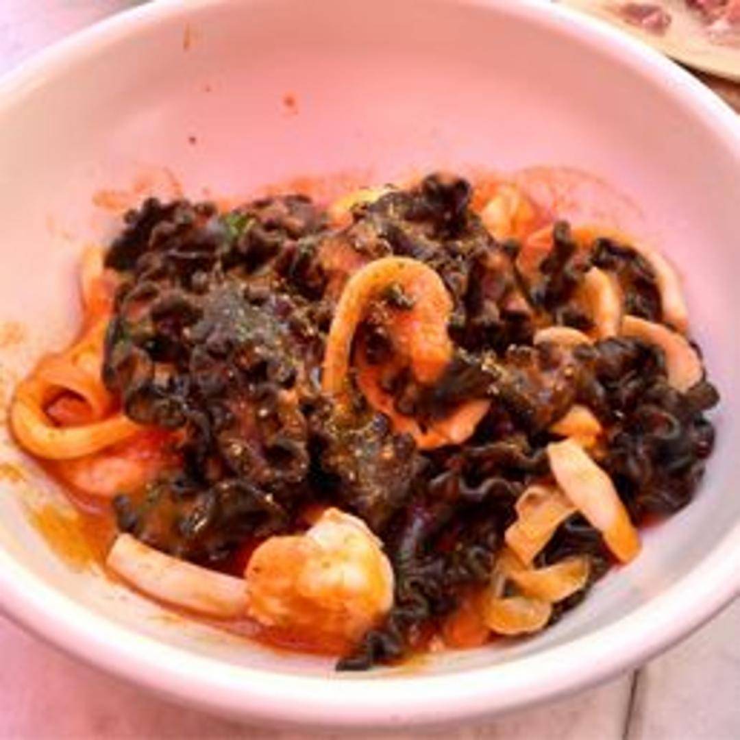 Distinctive mafaldine pasta, characterized by its ribbon shape and ruffled edges, infused with squid ink for a striking dark color and a subtle, delicate briny flavor. This unique pasta is often paired with seafood or light, vibrant sauces to highlight its exceptional character.