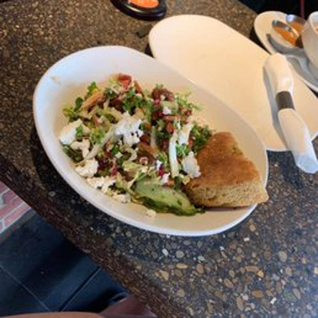 The signature Townsfair Salad is a balanced and flavorful creation, combining tender mixed greens, roasted sweet potatoes, toasted walnuts, crumbled goat cheese, and dried cranberries, all tossed in a light and tangy apple cider vinaigrette. Available with your choice of grilled chicken or a plant-based protein.