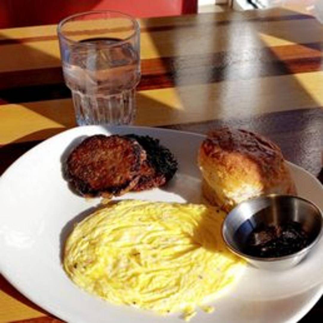 Our hearty Cowboy Breakfast is designed to fuel your day, featuring two farm-fresh eggs cooked to your preference, crispy breakfast potatoes, your choice of savory bacon or sausage, and a side of buttered toast. A robust and satisfying classic.